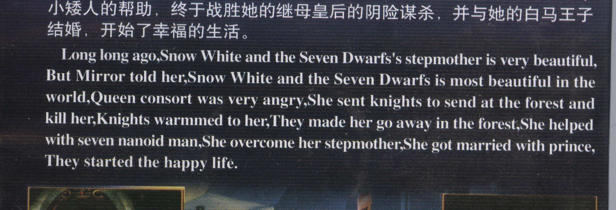 OK, det var grammatikken. Men hva skjer hvis man er ansatt som oversetter, og ikke egentlig skjønner innholdet av det man skriver? Hva om man tror at "Snow white and the seven dwarfs" handler om en jente som heter nettopp det? Nemlig "Snow white and the seven dwarfs":